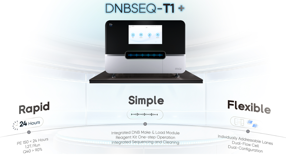 DNBSEQ-T1+ je jeden z nejrychlejších stolních sekvenátorů své kategorie na světě, vyvinutý s využitím základní sekvenční technologie DNBSEQ™ od společnosti MGI. T1+ podporuje souběžný provoz dvou flowcell a generuje až 1,2 Tb sekvenčních dat během 24 hodin (600 Gb na flowcellu, celkem 1,2 Tb pro dvě flowcelly). T1+ navíc nabízí volitelný vestavěný bioinformatický modul, který umožňuje automatizovanou pokročilou analýzu ihned po sekvenování.