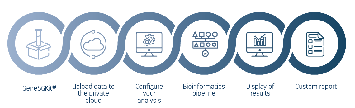 - Kompletní bioinformatická analýza a vizualizace výsledků pomocí GeneSystems©: Data jsou zpracována za méně než 48 hodin, s hodnocením proti nejnovějším verzím více než 100 databází, veřejných i soukromých.