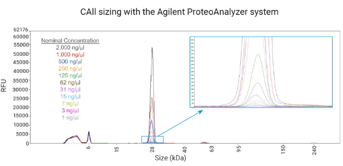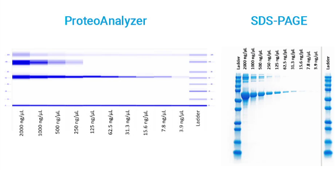 Systém ProteoAnalyzer analyzuje malé i velké vzorky proteinů od 10 kDa do 240 kDa současně v jednom běhu, což umožňuje vědcům efektivně provádět různá hodnocení kvality a kvantity proteinů na automatizované elektroforetické platformě s využitím univerzální sady Protein Broad Range P240 Kit.