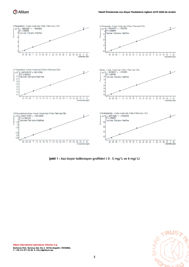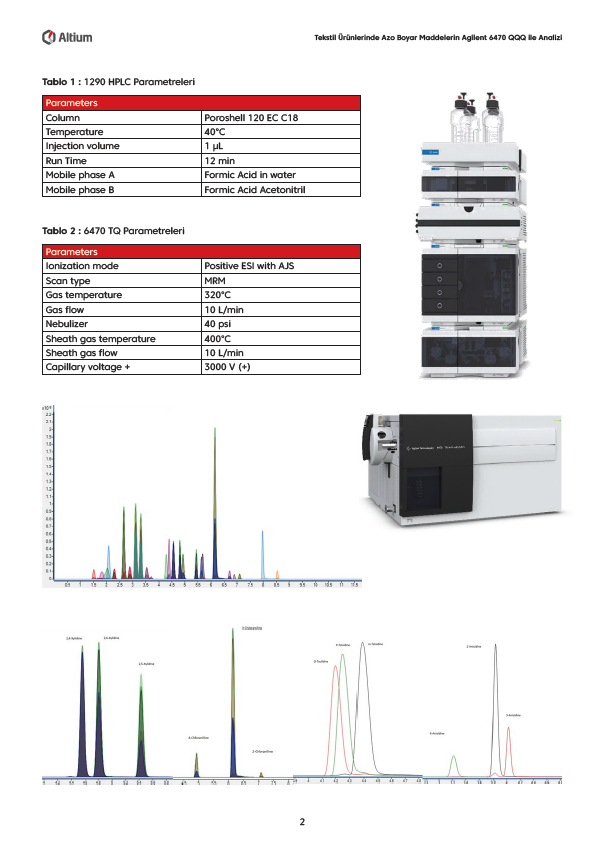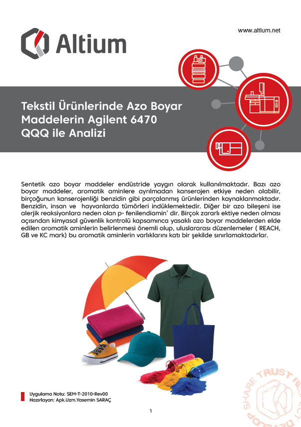 Kanserojen etkiye neden olan sentetik azo boyar maddeler endüstride yaygın olarak kullanılmaktadır. Benzidin, p- fenilendiamin gibi azo bileşikler; insan ve hayvanlarda alerjik reaksiyonlara neden olması açısından kimyasal güvenlik kontrolü kapsamınca yasaklı azo boyar maddelerden elde edilen aromatik aminlerin belirlenmesi önemli olup, uluslararası düzenlemeler ( REACH, GB ve KC) bu aromatik aminlerin varlıklarını katı bir şekilde sınırlamaktadırlar.Bu amaçla Agilent LC/QQQ sisteminde geliştirmiş olduğumuz metodumuzu inceyebilirsiniz.